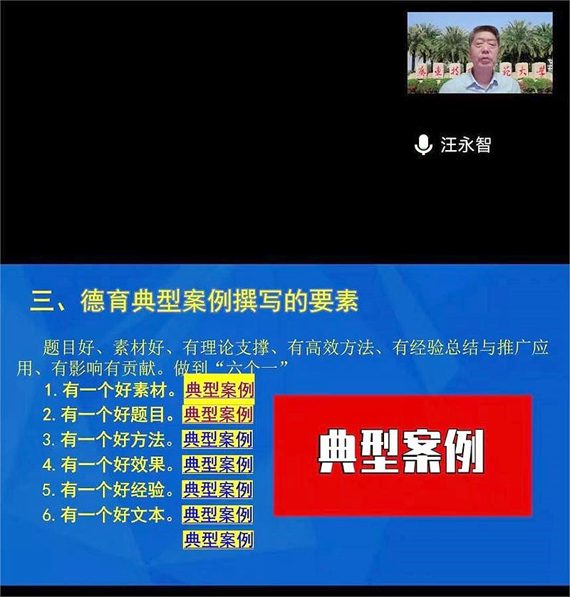 随后汪教授对德育典型案例撰写的“六个一”要素做出了详细解析,并结合习近平总书记语录与“三全育人”典型学校的汇报案例进行了生动的展示。要想撰写出一个精彩的德育典型案例,要做到“有一个好素材、好题目、好方法、好效果、好经验、好文本”。