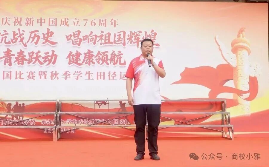 侯伯云校长指出,今年是新中国成立76周年、抗战胜利80周年,“历史是最好的教科书,也是最好的清醒剂”,回顾先烈以血肉之躯换来民族独立、新中国开启人民当家作主新纪元的历程。他强调,同学们身处不和平的时代,却幸生于共产党领导的和平国家,号召大家用歌声致敬先烈、礼赞祖国,在校园赛场挥洒青春,融入“强国有我”大潮。最后,侯校长寄语师生接过历史接力棒,以歌声铭记历史、用运动强健体魄,将抗战精神与爱国赤诚转化为成长力量,成长为新时代好青年,并预祝活动圆满成功、同学们收获精彩!