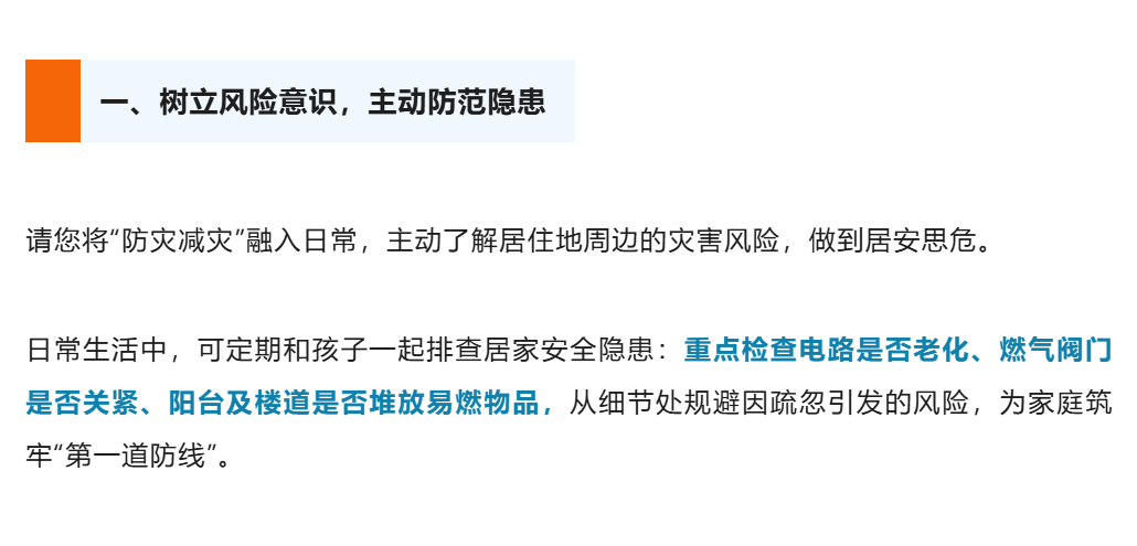 灾害风险常隐于日常,可能是居家用电的小隐患、汛期的强降雨,也可能是地震、火灾等突发情况,唯有科学认知、充分准备,才能主动防范。