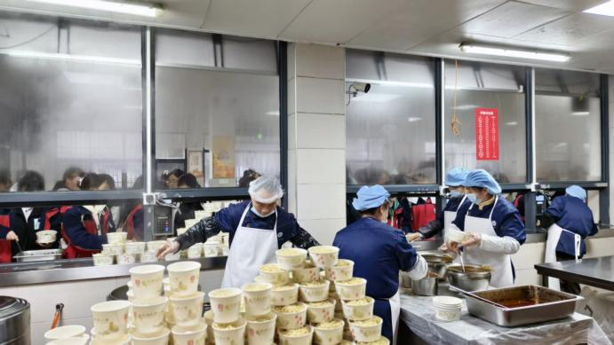 中午十二点,午餐高峰如期而至,打餐窗口前排起长队。员工们重复着出餐动作,即便手臂酸痛仍笑容不减,凭借对常客口味的熟悉,精准满足不同人的饮食偏好。就餐结束后,收拾餐盘、清理残羹、刷洗餐具、消毒餐桌,每一个角落都被打扫得一尘不染,餐具需经清洗、消毒、烘干多道流程,筑牢卫生安全防线。