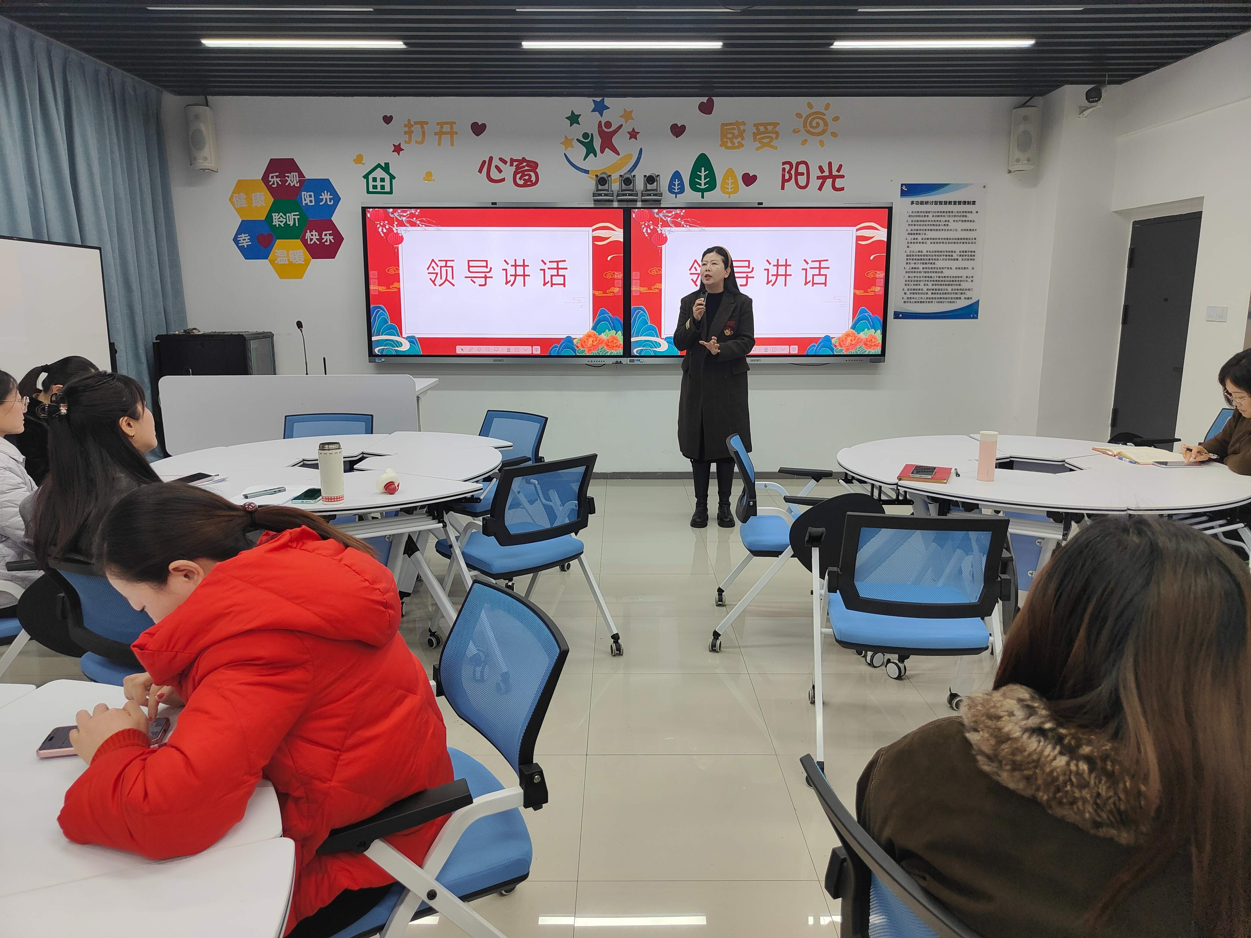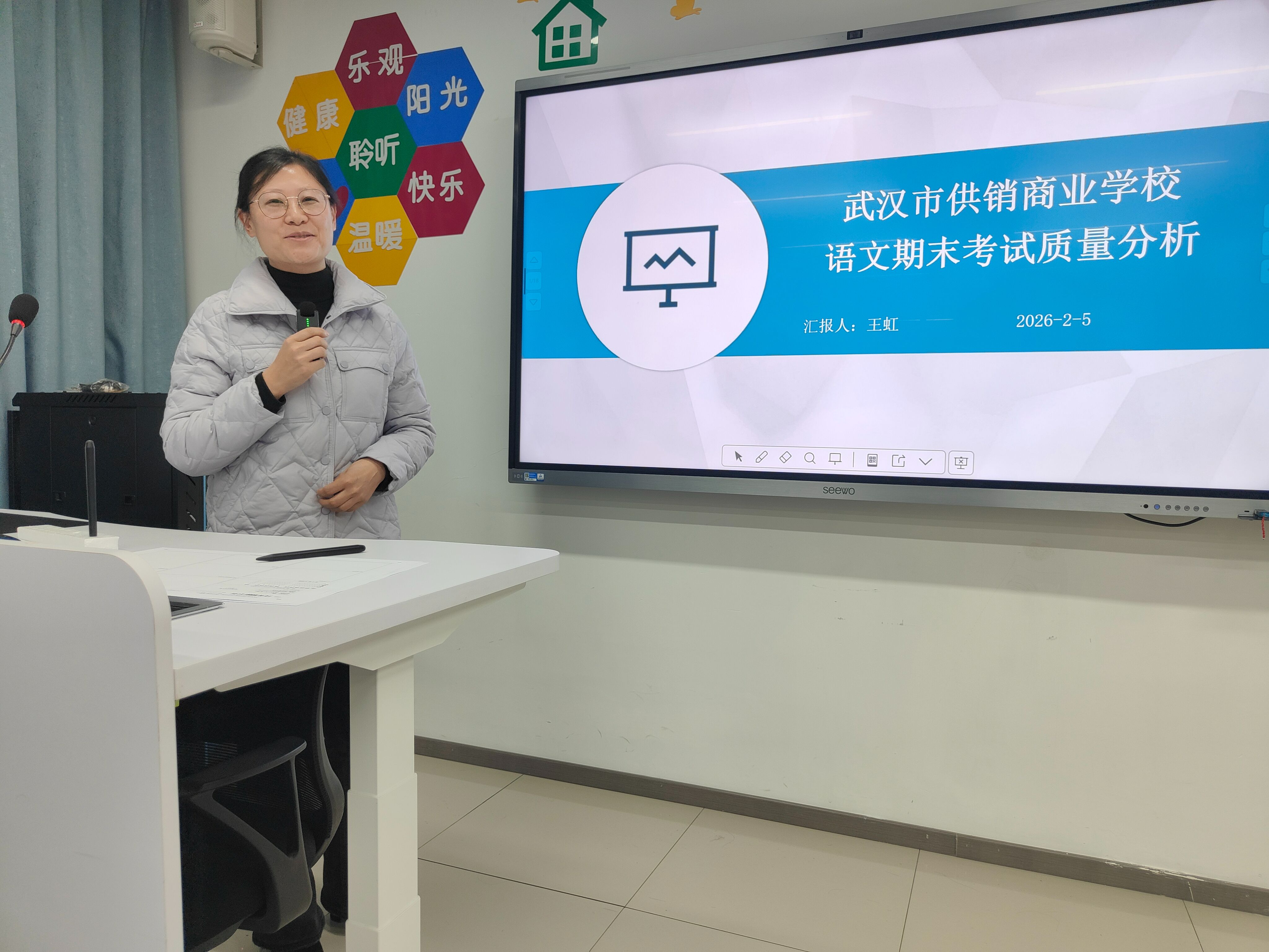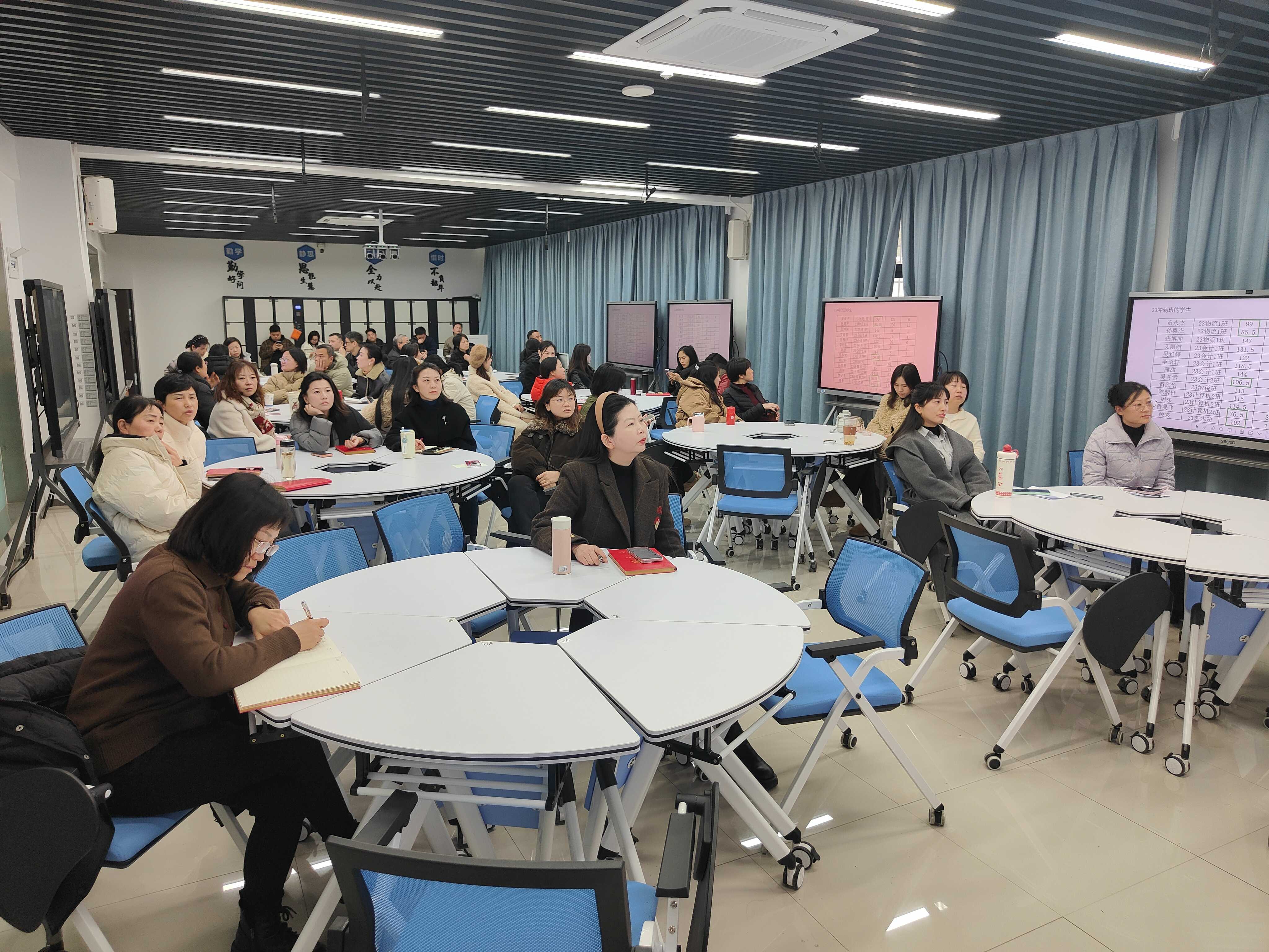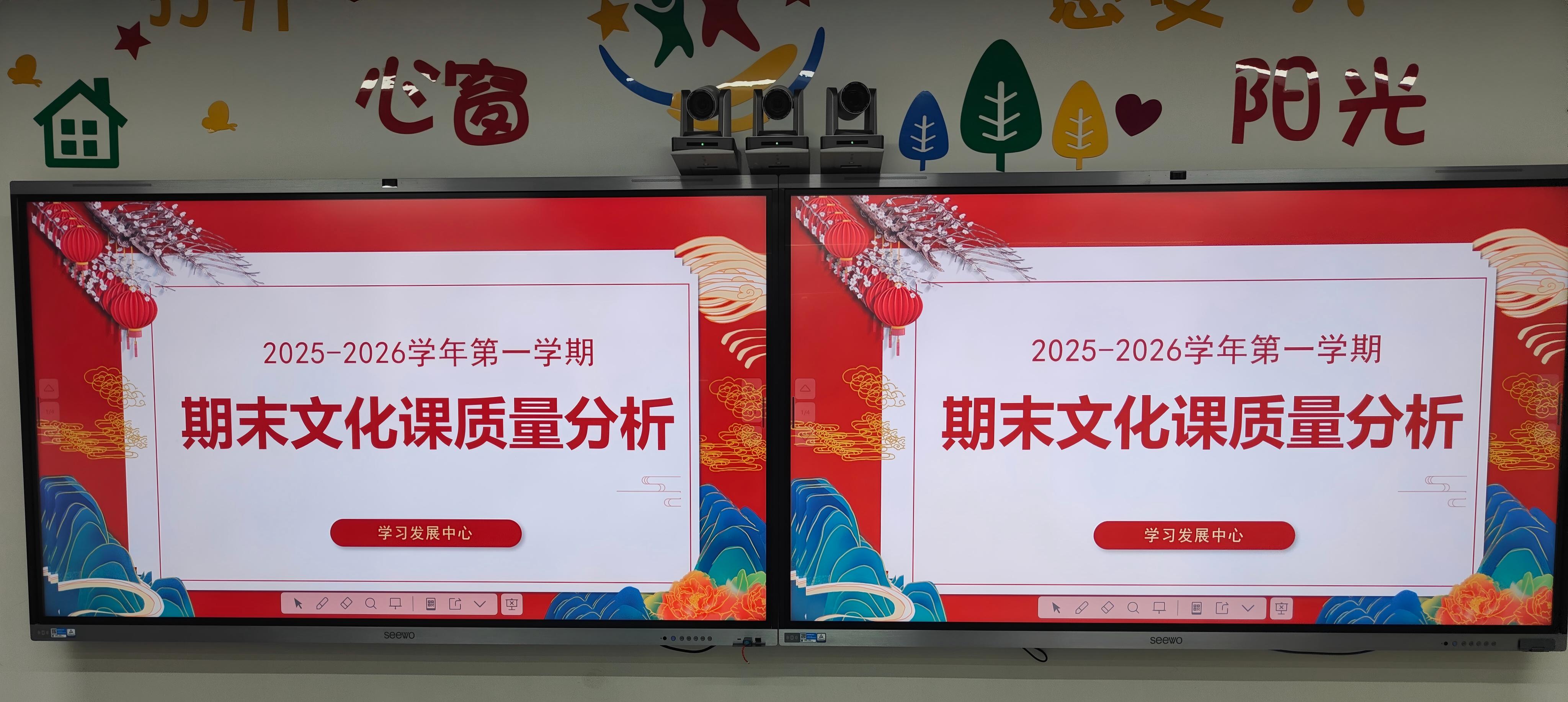 在2013教室,何宁主任对期末三个年级的文化课进行总体质量分析。何宁、王虹、李娜三位老师分别就期末数学、语文、英语三科质量进行深入分析。各位主讲人从试卷结构、成绩分布、典型错误、改进措施等维度展开,数据详实、分析透彻。张莹珺副校长作总结讲话,要求文化课教师关注学生基础能力培养,加强学科融合,提升教学针对性。