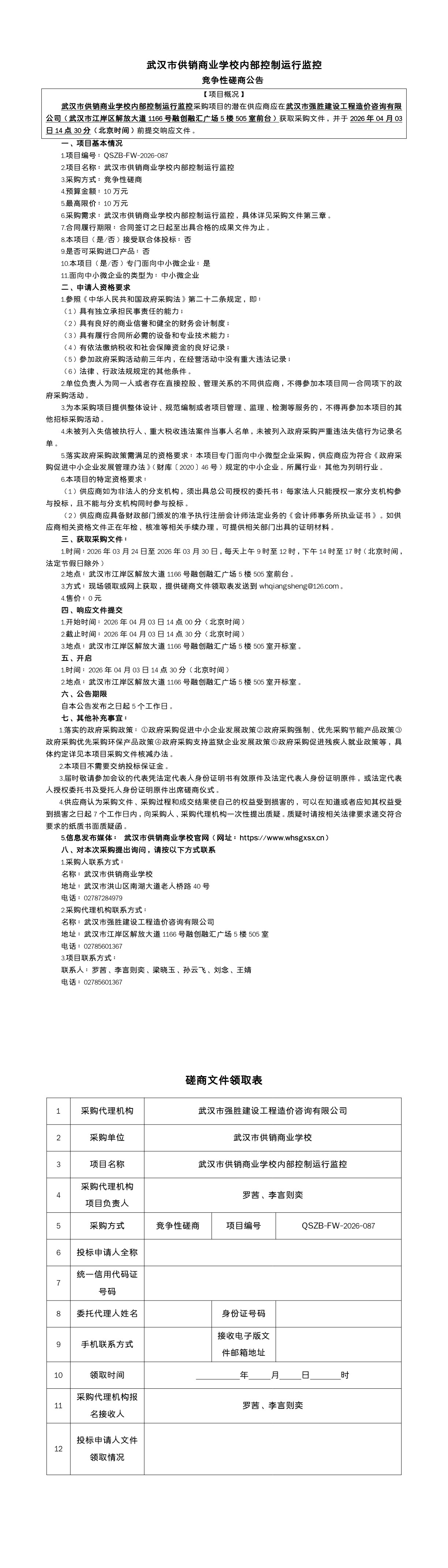 武汉市供销商业学校内部控制运行监控竞争性磋商公告